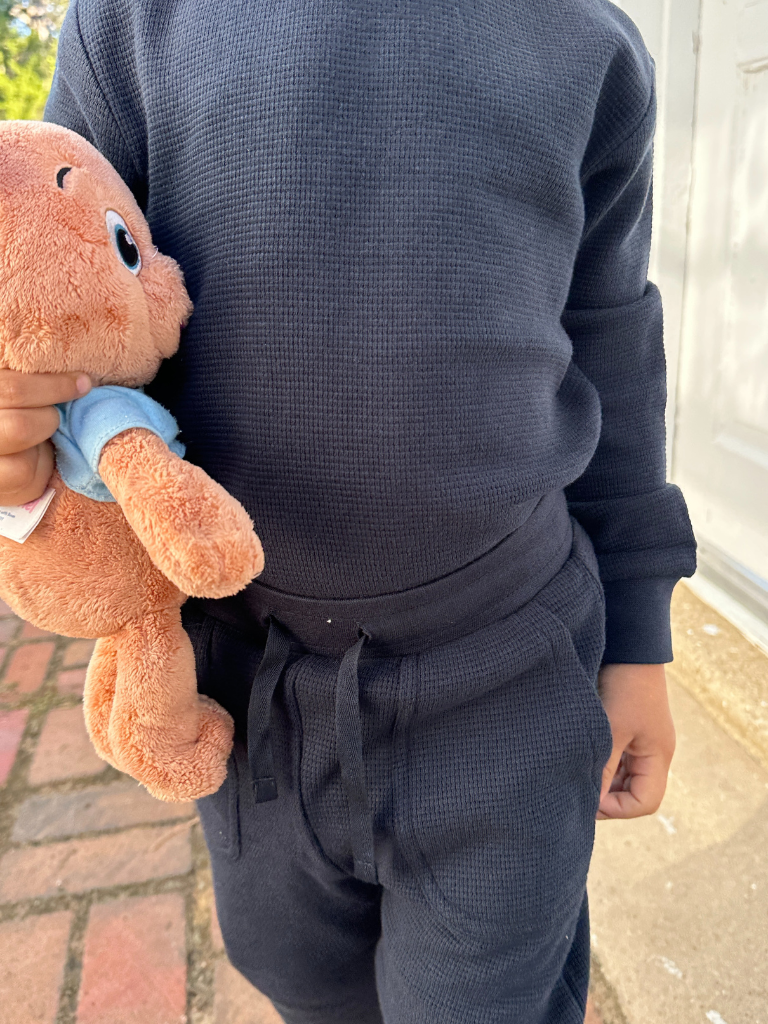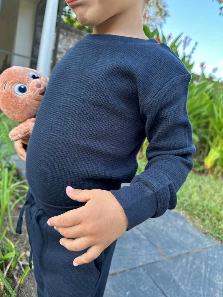 Simple, stylish, and snuggly—our Dark Sapphire Crew Neck is a must-have for little wardrobes. Made from 100% organic cotton with a soft waffle knit texture, it’s breathable, cozy, and perfect for everyday wear. Pair it with our joggers for the cutest matching set that’s ready for playdates, cuddles, and everything in between.